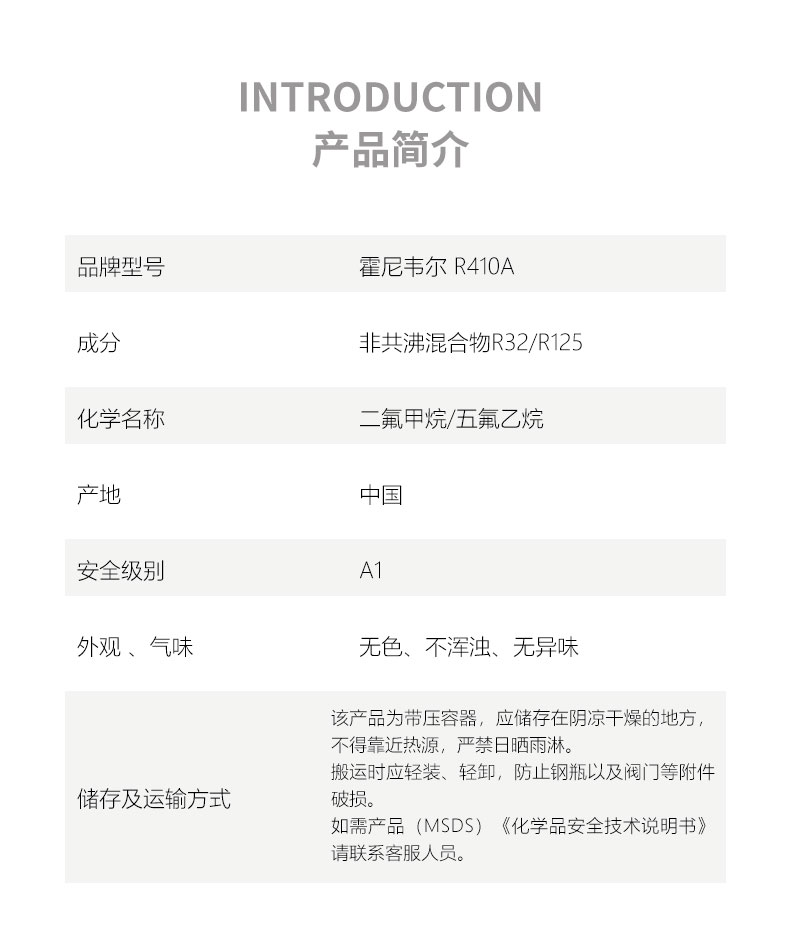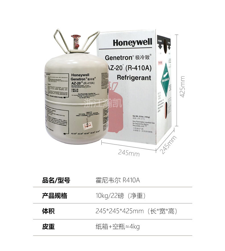 霍尼韋爾R410A制冷劑,商品名稱(chēng)為Genetron AZ-20、Genetron 410A、Honeywell R-410A等。由于霍尼韋爾R-410A屬于HFC型近共沸環(huán)保制冷劑(完全不含破壞臭氧層的CFC、HCFC),廣泛用于新冷凍設(shè)備上的初裝和維修過(guò)程中的再添加。