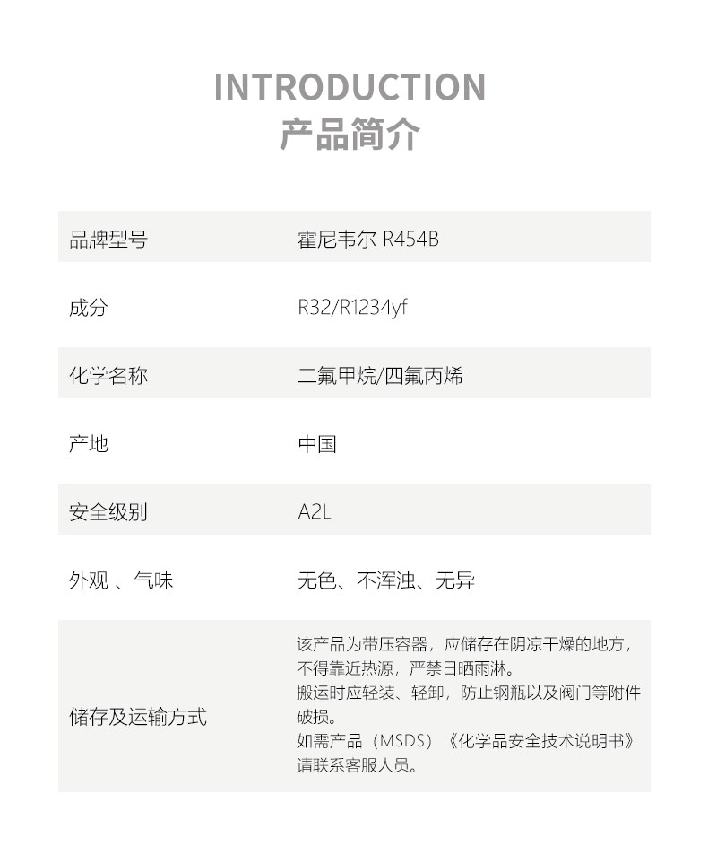 品牌型號:品牌型號:Honywell Solstice? R454B 產(chǎn) 地:中國 化學成分:R1234yf/R32 分 類:混合物 安全級別:A2L(無毒不可燃) 純 度:≥99.98% 包裝規(guī)格:9.75kg
